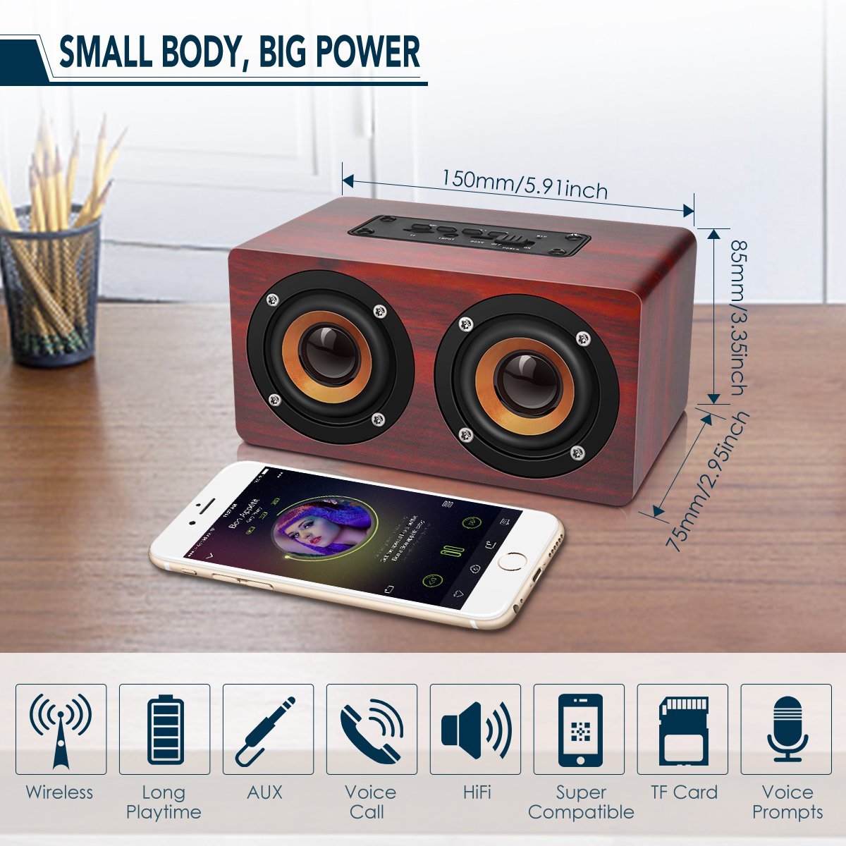 ♫Sonido de graves súper pesados: dos altavoces de 52 mm crean un bajo súper pesado La madera sintética de alta densidad elimina efectivamente la mala resonancia para hacer que el sonido sea grueso y constante.